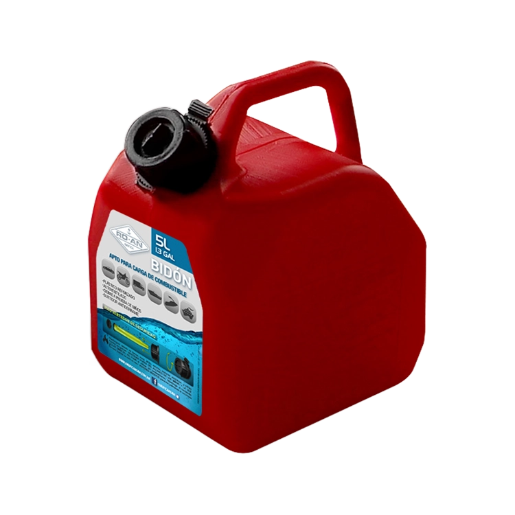 Bidón de plástico autoventilado apto para transporte de combustible de 5 litros de capacidad aprobado por Prefectura Naval Argentina. Equipado con pico surtidor antiderrame y cierre resistente a los niños. Fabricación nacional.