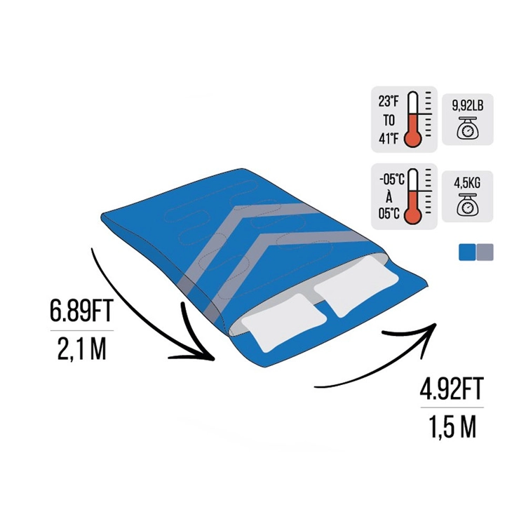 Bolsa de dormir doble (matrimonial) NTK Kuple Camo. Posee capucha, cintas compresoras y 2 almohadas. Puede ser utilizada a acoplando formando una bolsa de pareja o por separado para uso individual.