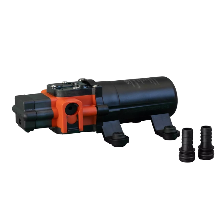 La bomba es autocebante (hasta 76cms en forma vertical) y entrega 1.2 galónes (4.5 lts.) por minuto. Está compuesta por un motor de 12 Volts de bajo consumo protegido térmicamente, y un sensor de presión de 40 PSI.