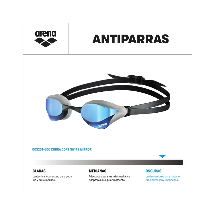 Las antiparras Arena Cobra Core Swipe Mirror producidas en Japón y con aprobación FINA son la perfección hidrodinámica. Con lentes de perfil bajo espejados, molduras de alta tecnología y una silueta afilada, las antiparras Arena Cobra Core Swipe Mirror minimizan la resistencia contra el agua con un diseño ultra elegante y super hermético; son ideales para nadadores de nivel intermedio y expertos. ¡Además son perfectas para triatlon!