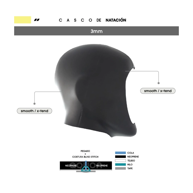 Fabricado con neoprene super elástico (hyperstretch) de 3,0mm de espesor para garantizar un gran ajuste y flexibilidad durante la natación. Las costuras son ciegas (blind stitch), con neopreno pegado y cosido que no agujerea el material, lo que impide el flujo constante de agua. El agua que ingresa, forma una fina película entre el neoprene y el pie, que es calentada por el calor corporal. Y este mismo calor es el que mantiene la cabeza confortable durante la actividad.
