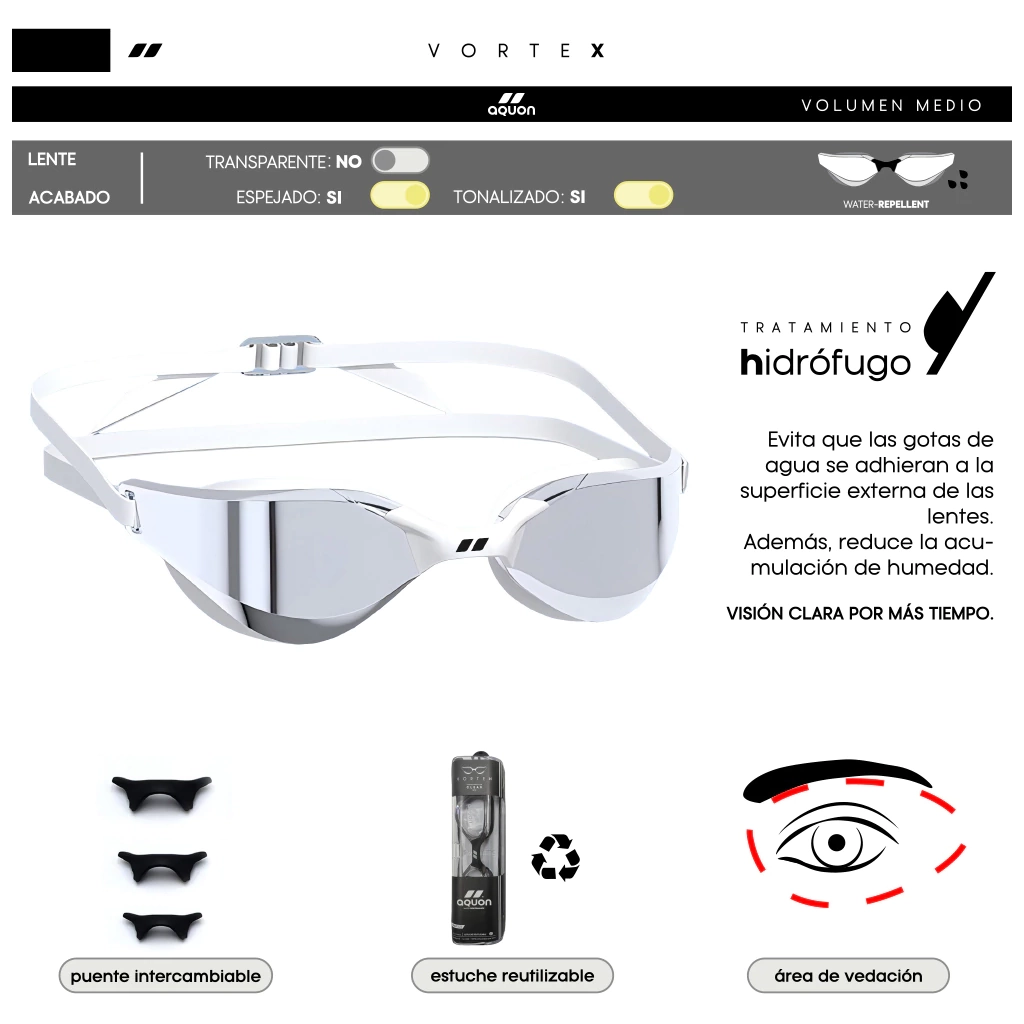 La antiparra Vortex Mirror está diseñada para lograr el mayor rendimiento y confort durante la práctica de natación en aguas abiertas o pileta. Su perfil hidrodinámico con baja resistencia al agua, la hace ideal para quienes buscan velocidad en distancias cortas.