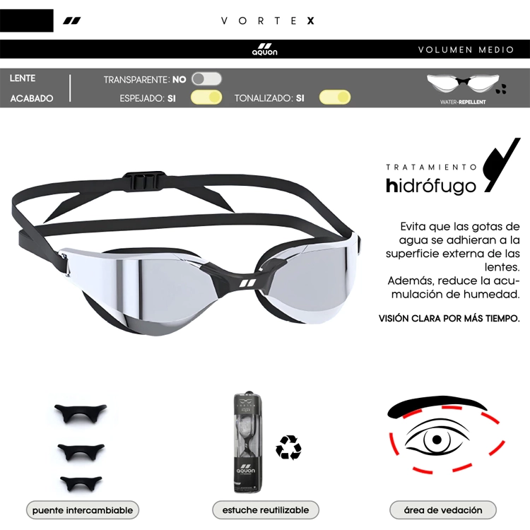 La antiparra Vortex Mirror está diseñada para lograr el mayor rendimiento y confort durante la práctica de natación en aguas abiertas o pileta. Su perfil hidrodinámico con baja resistencia al agua, la hace ideal para quienes buscan velocidad en distancias cortas.