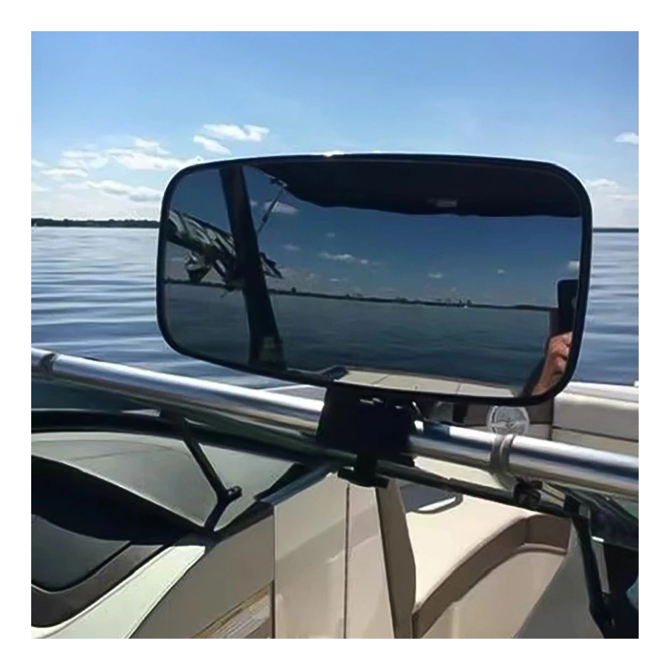 El espejo Náutico ofrece aproximadamente 98 pulgadas cuadradas de visión trasera para lo último en seguridad en bote. El espejo es perfecto para deportes acuáticos competitivos y se considera un estándar de torneo en seguridad. El cabezal del espejo cuenta con vidrio de seguridad convexo inastillable de grado OE y cumple con las normas QS9000 e ISO 9002. Para que el vidrio sea considerado de grado OE debe utilizar una técnica llamada primer revestimiento superficial. El primer revestimiento de superficie proporciona una imagen de alta calidad que elimina síntomas como fantasmas y múltiples reflejos. El resultado es una vista nítida y clara. Se puede montar en marcos redondos del parabrisas de 0.375 a 1 pulgada de diámetro. Una vez montado, se colocará aproximadamente 3.0 in por encima del parabrisas. El soporte de montaje adjunto está hecho de aluminio y tiene un acabado texturizado negro. Se fija al parabrisas con un diseño de sujeción rápido y fácil. Este espejo también está disponible para barcos con marcos de parabrisas cuadrados que son 0.375 a 1 pulgada de espesor. El paquete incluye 1 cabezal de espejo de 7 x 14 pulgadas, 1 conjunto de soporte redondo de aluminio recubierto de polvo negro, 1 perilla de ajuste principal, 2 botones de ajuste pequeños, 1 clip de fijación , 1 tira de neopreno y 1 placa espaciadora con neopreno.